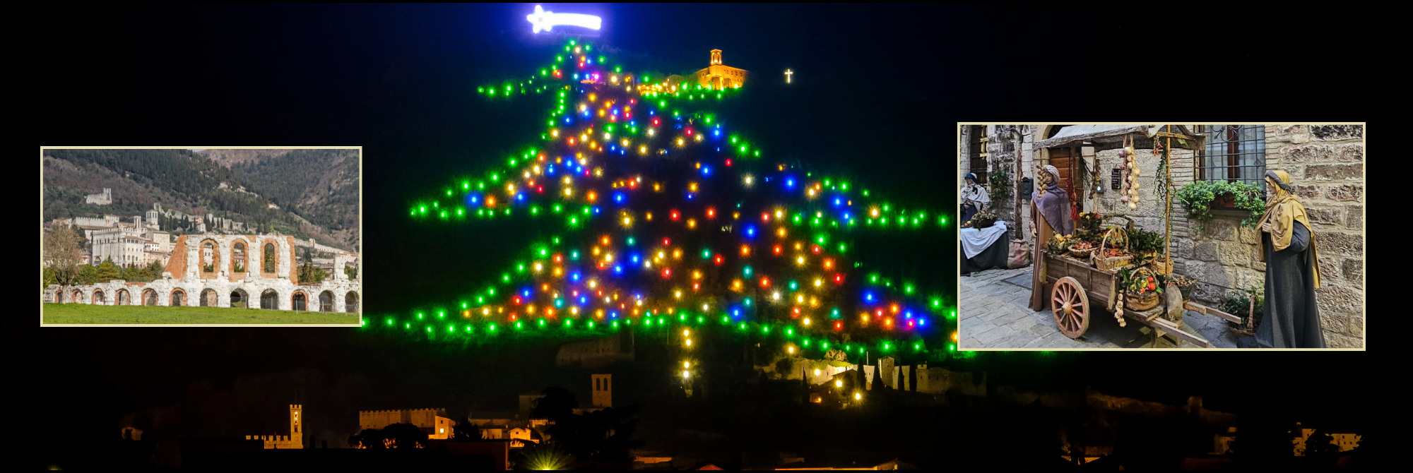 L’albero di Natale che ogni anno dal 1981, la sera del 7 dicembre vigilia dell’Immacolata, si accende sulle pendici del Monte Ingino è del tutto speciale. E’ il più grande del mondo; è ormai un simbolo di Gubbio. Sale dalle ultime case di pietra del Centro storico fino alla Basilica di Sant’ Ubaldo, patrono della città, nei cui pressi risplende la stella cometa che completa l’albero stesso. Quattrocento metri di luce per annunciare il Natale e per garantire a Gubbio un altro record. La sagoma luminosa che riproduce la forma di un abete è finita giustamente nel Guinness dei primati.
